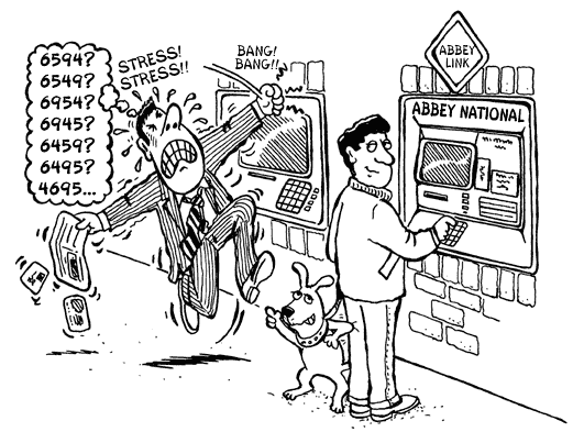 Cartoons to illustrate Abbey National's press release...ABBEY NATIONAL HELPS SOLVE THOSE PIN-HEAD ACHES! Keanu Reeves may have coped with information overload in 'The Matrix' but for many people it is often a case of 'too many numbers'. Research published by Abbey National has found the saturation of Personal Identification Numbers(PINs) is causing endless problems for British consumers.