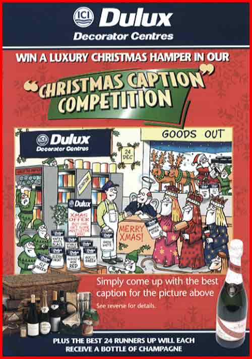 | The brief : create a cartoon caption competition to illustrate Dulux Decorator Centres at Christmas time, allowing different opportunities for captions. Is Santa nicking paint yet again? Have the sheperds lost their sheep skin paint rollers? Or are the elves going to do all the work over the xmas break, while you take it easy? |