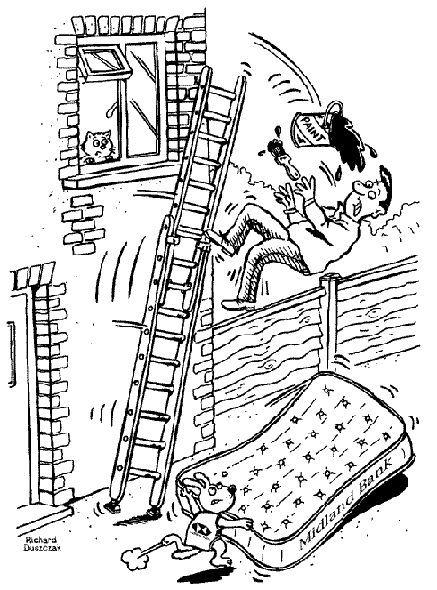 | HOME SWEET HOME! Home safety: Midland Bank gets personal with cash benefits plan. With over three million accidents in the home each year, Midland Bank has launched a personal accident plan, and joined forces with RoSPA(The Royal Society for the Prevention of Accidents.) to produce a free home safety booklet for customers. This cartoon accommpanied the above press release to catch the attention of news editors. |