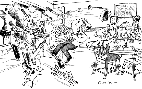 The popular image of dinner parties as relaxing evenings - entertaining friends over a special meal at home - is blown apart by the findings of a new NOP survey that reveals a quarter of hostesses are actually so stressed that they resort to physically throwing items around the kitchen. (Final version was done in full colour.) |