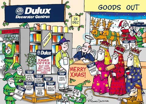 | Christmas card design for Dulux, also used as a cartoon caption competition for customers in Dulux Trade Centres. | |||||||