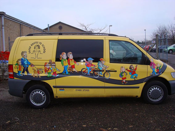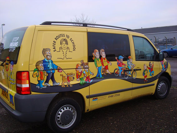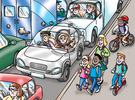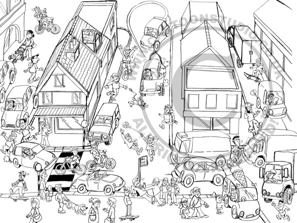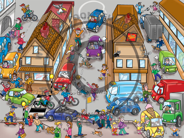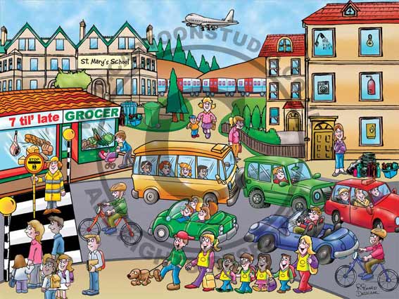 The aims of my cartoons: Help highlight and reduce the number of pedestrian and cyclist injuries. Help highlight and improve the safety of the journey to and from schools. Help highlight and reduce the number of car trips to and from schools. Help highlight and encourage walking and cycling to and from schools. Help highlight and educate children to cope with their local road environment. Help work with the community to create an environment which is safer for all. I work on a project called Safer Routes to School, our aim is to promote sustainable transport for the school run (walking, cycling and public transport) We work with schools in Cambridgeshire, and as well as traffic calming and associated engineering works we also have commissioned some education resources. Currently we are working on an interactive exhibit which demonstrates the health and environmental benefits of walking and cycling. I have attached a photo of the exhibit. The exercise bike in the photo is linked to the display which shows the calories burned during a 90 second session on the bike and compares them to an inactive journey in the car, there are also supporting quiz games to play on a linked computer. I thought I would get in touch to ask about having a cartoon drawing of a street scene for a follow up to this project which would be used in an interactive presentation - I've put a link below to the sort of thing I mean as it is a bit hard to explain! We have a company in Scotland making the interactive exhibit for us, they did the first stage and we are now extending the idea and as part of the computer package I want to have some interactive information screens, the example I have put in a link for you is a bit dull to look at but that is the basic idea that I am looking to use. Having looked at your website and liked your work, I wanted to get some idea of whether you would be interested in doing an illustration with the sort of content on the sample I sent you but obviously more attractive and interesting to look at! Currently there's a vicious circle, parents and carers drive their children to school causing an increase in traffic and congestion around schools - big 4 x4's mounting pavements to find a drop off place. Fewer children walk or cycle to school. Parents and carers say todays roads are too dangerous. So the vicious circle continues. Safer Routes to School is aiming to break this cycle. Together we will nurture healthier pupils and staff members, reduce congestion around our schools and improve road awareness in children. The pdf was our initial ideas for this - sadly the Safer Routes logo did not get approval from our County Councillors and would need to be replaced by the one in the gif (attached) it's a grim image but they like it as we have used it for ages!! The street picture I like is called 'watch out hazards about' and I would like something like this 3d pictorial map picture for our project. The idea is to get children to look at the picture and then when they hover over it with the computer mouse information boxes will appear about the safety level of an activity such as playing in the street, cycling dangerously and without a cycle helmet, skateboarding in the street kids trying to cross between parked cars, or the safest place to cross or unsafe parking or driving. So I would like a variety of images of road safety in the picture. This is the drawing I would need by the end of the month! Some other ideas for the picture... Car doing u turn, cyclists with passenger on the back of the bike, kids chasing a ball, a dog off the lead by the road, kids running out to an ice cream van, kids dashing across the road near the zebra crossing but not using it, kids playing chicken with traffic, kids messing about near the bus stop, kids cycling with hands off the handle bars, a lorry driver using a mobile phone. If you could let me know if it would be possible for you to produce something for us along these lines? |
