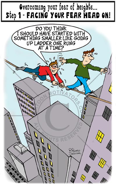 Today we look at one of my biggest phobias - Fear Of Heights. I miss out on bungee jumps, going up skyscrapers and going on scenic mountain walks. I suffer from breathlessness, excessive sweating, nausea, dry mouth, shaking, heart palpitations, inability to think clearly, a fear of dying, becoming mad or losing control, a sensation of detachment from reality or a full blown anxiety attack...and that was just while I was drawing the cartoon!