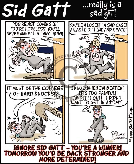 Today's subject is the College/School of hard knocks. To be a success at anything you have to take some hard knocks. If you're not taking the knocks chances are you're a failure who's backed off or quit. Here's some of my favourite quotes and a Sid Gatt cartoon strip...